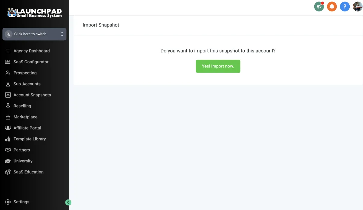 Click the snapshot link. Click the green 'Import' button that pops up, and have your entire account created in minutes. Everything is ready to connect to your domain. Use the simple page editor and workflow builder to get the everything branded for your company.
